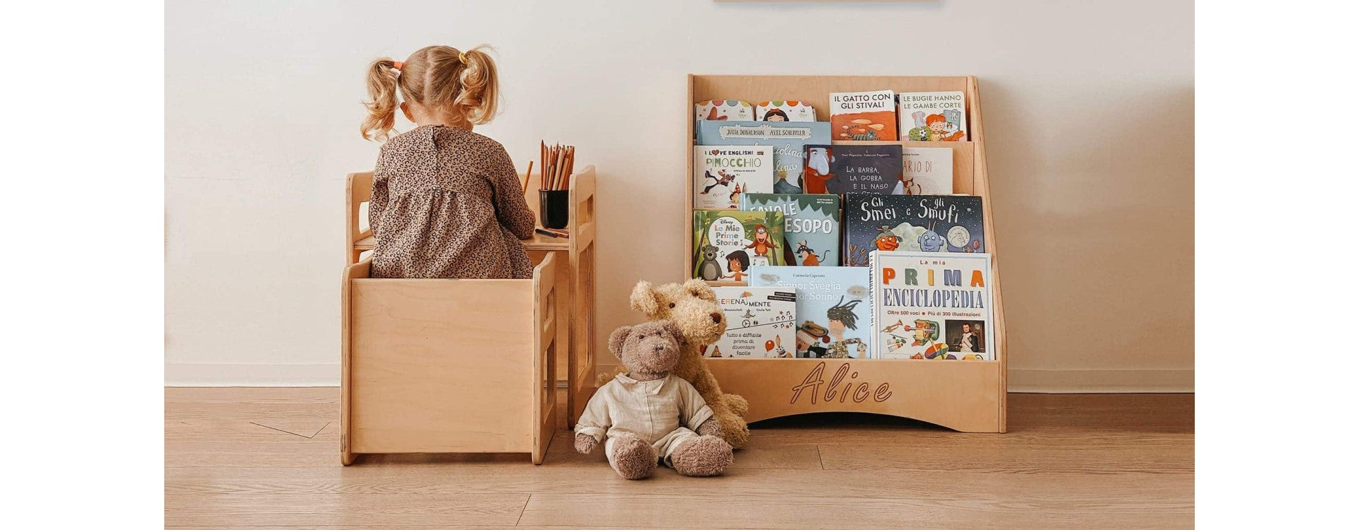 Libreria Montessoriana: è pensata per stimolare l'interesse dei bambini per la lettura e facilitare l'accesso ai libri in modo indipendente. Le librerie Montessoriane sono progettate a misura di bambino, con ripiani aperti che consentono di visualizzare chiaramente i libri e di accedere facilmente a essi. Questo design mira a favorire la libertà di scelta, incoraggiando l'amore per la lettura e lo sviluppo delle capacità cognitive.