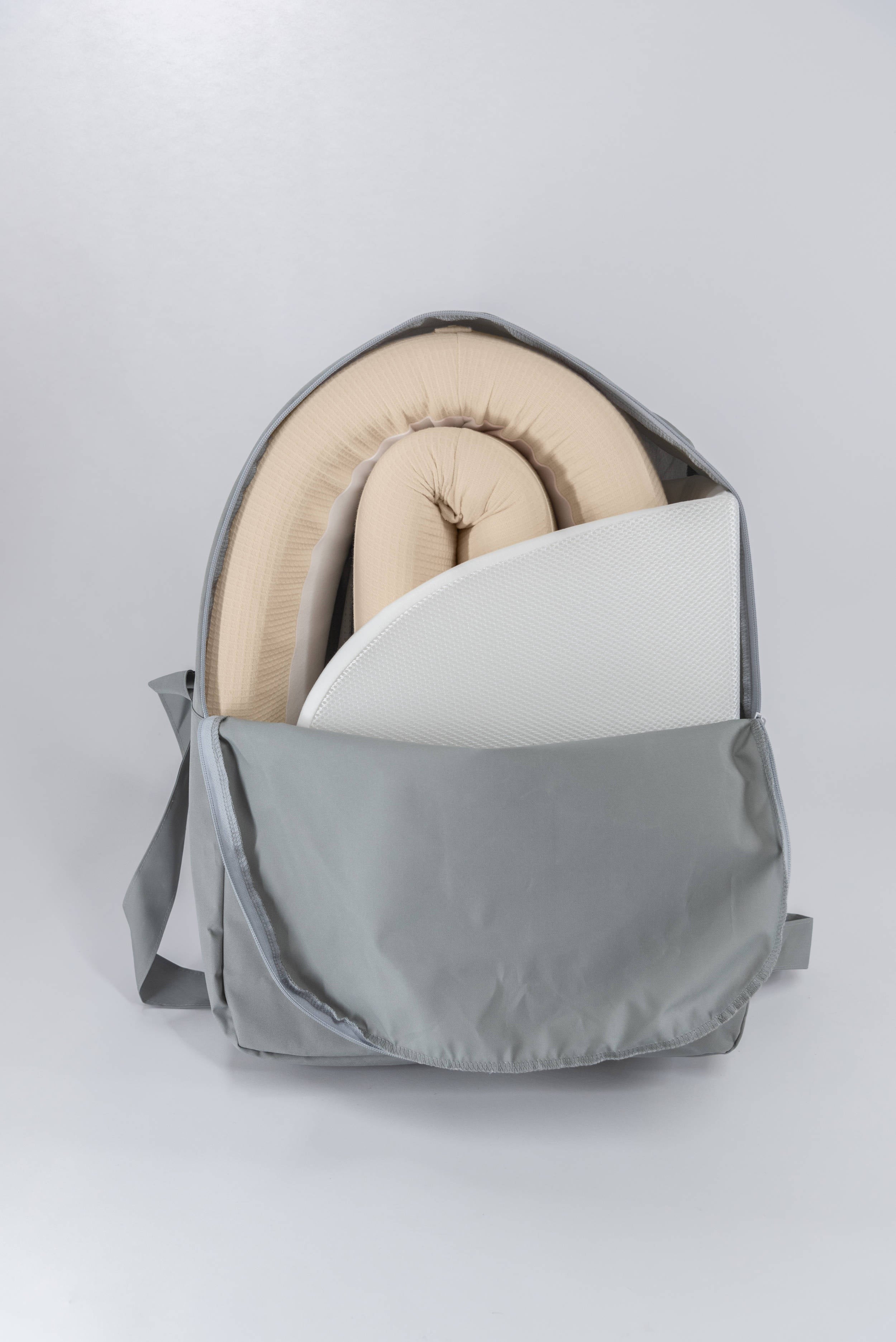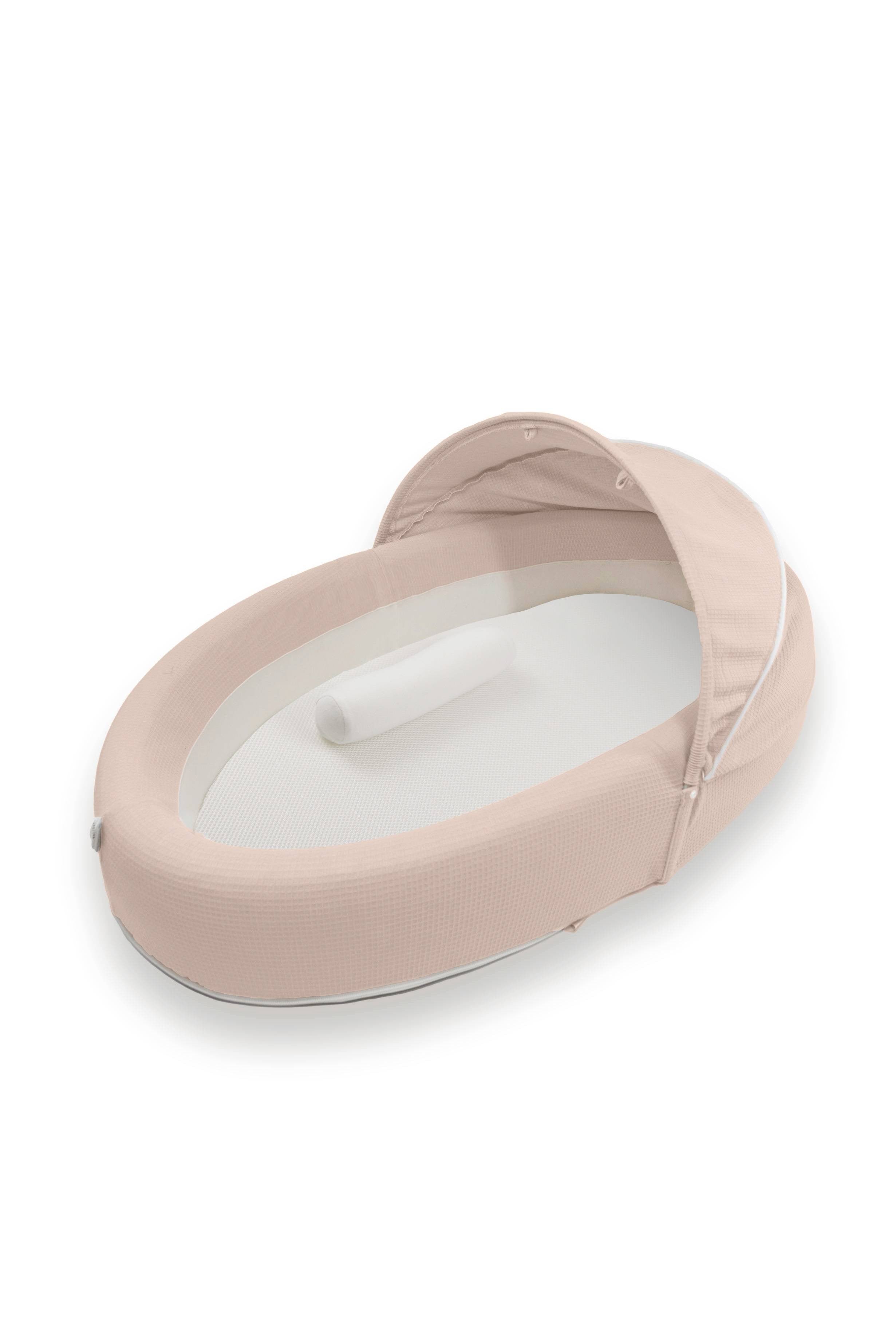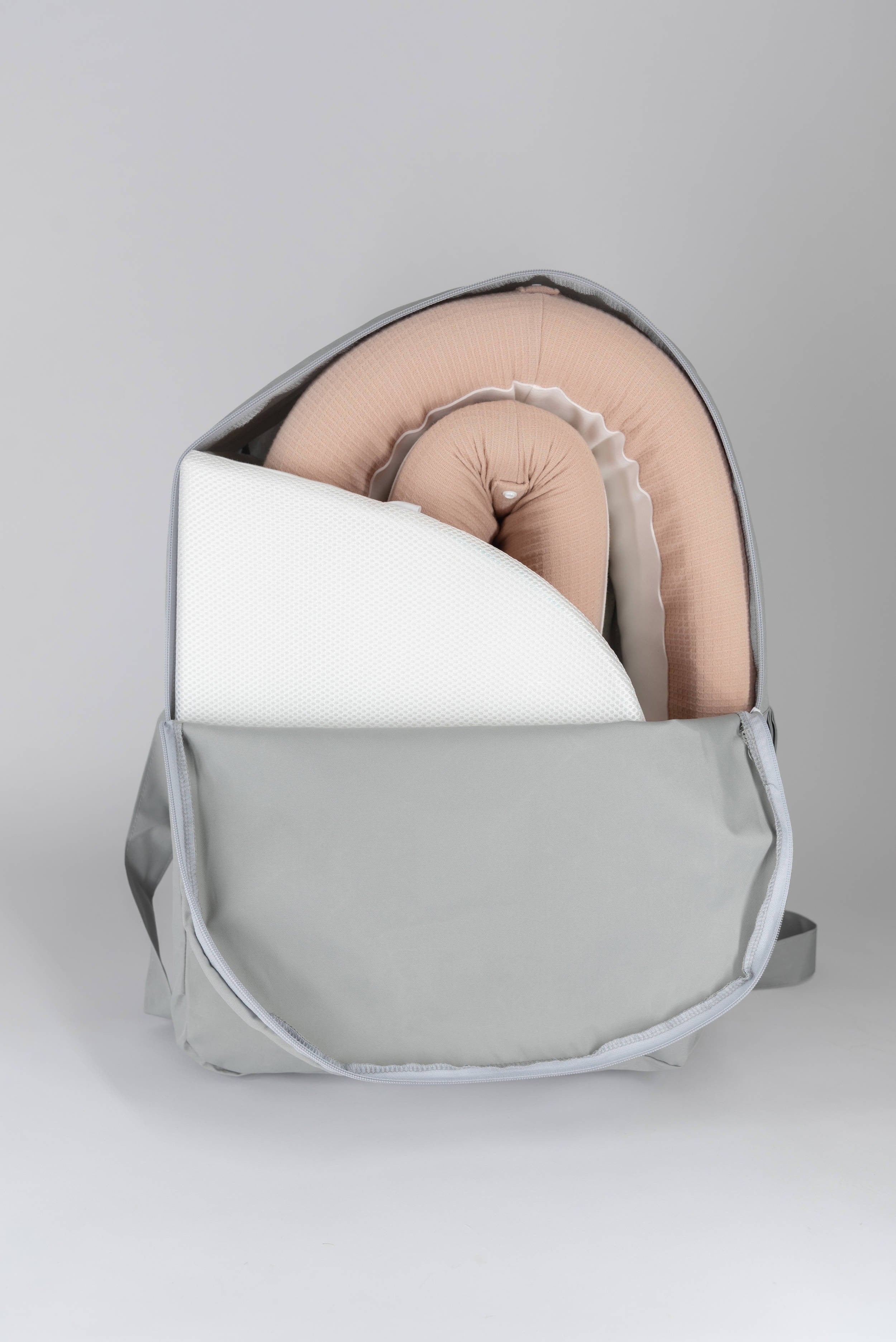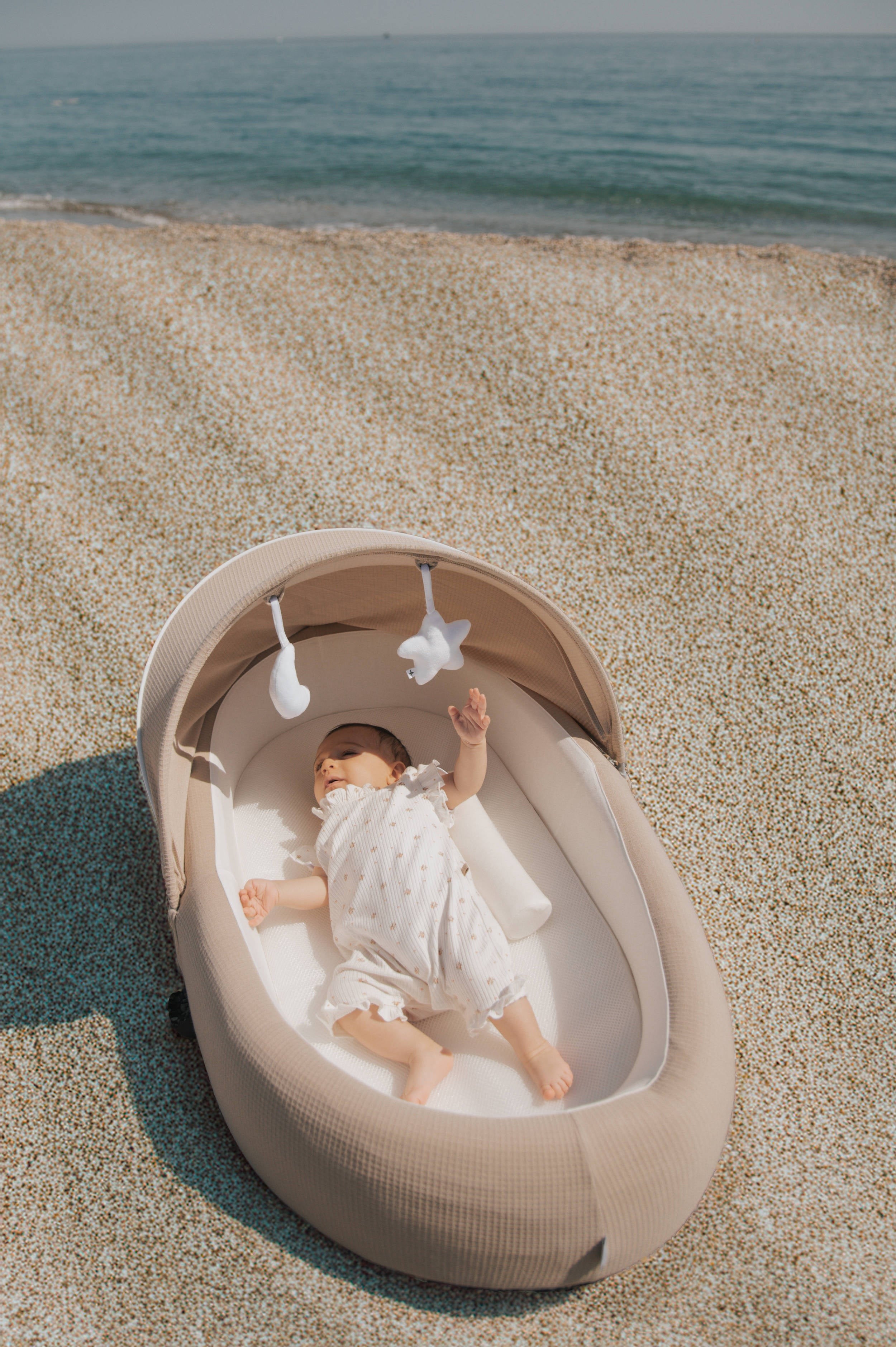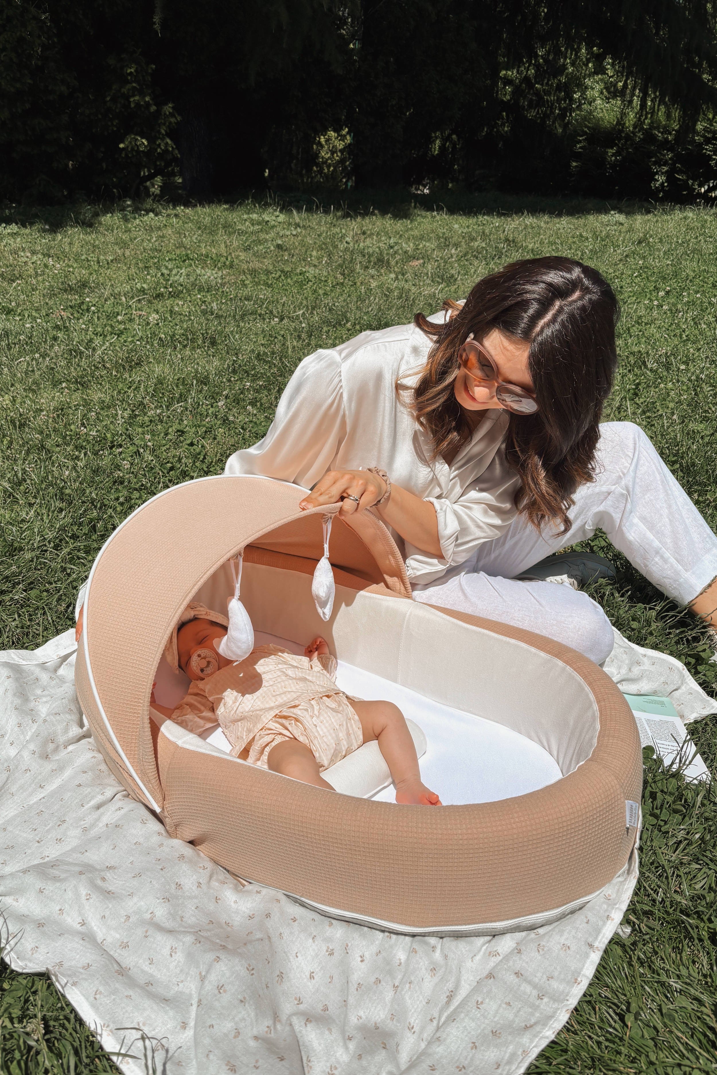 Babynest Airflow 2.0 di Bamboom: riduttore traspirante in bambù e cotone con materassino 3D, supporto per tummy time, zanzariera, cappottina e accessori. Comfort e sicurezza per il tuo neonato, anche in viaggio.