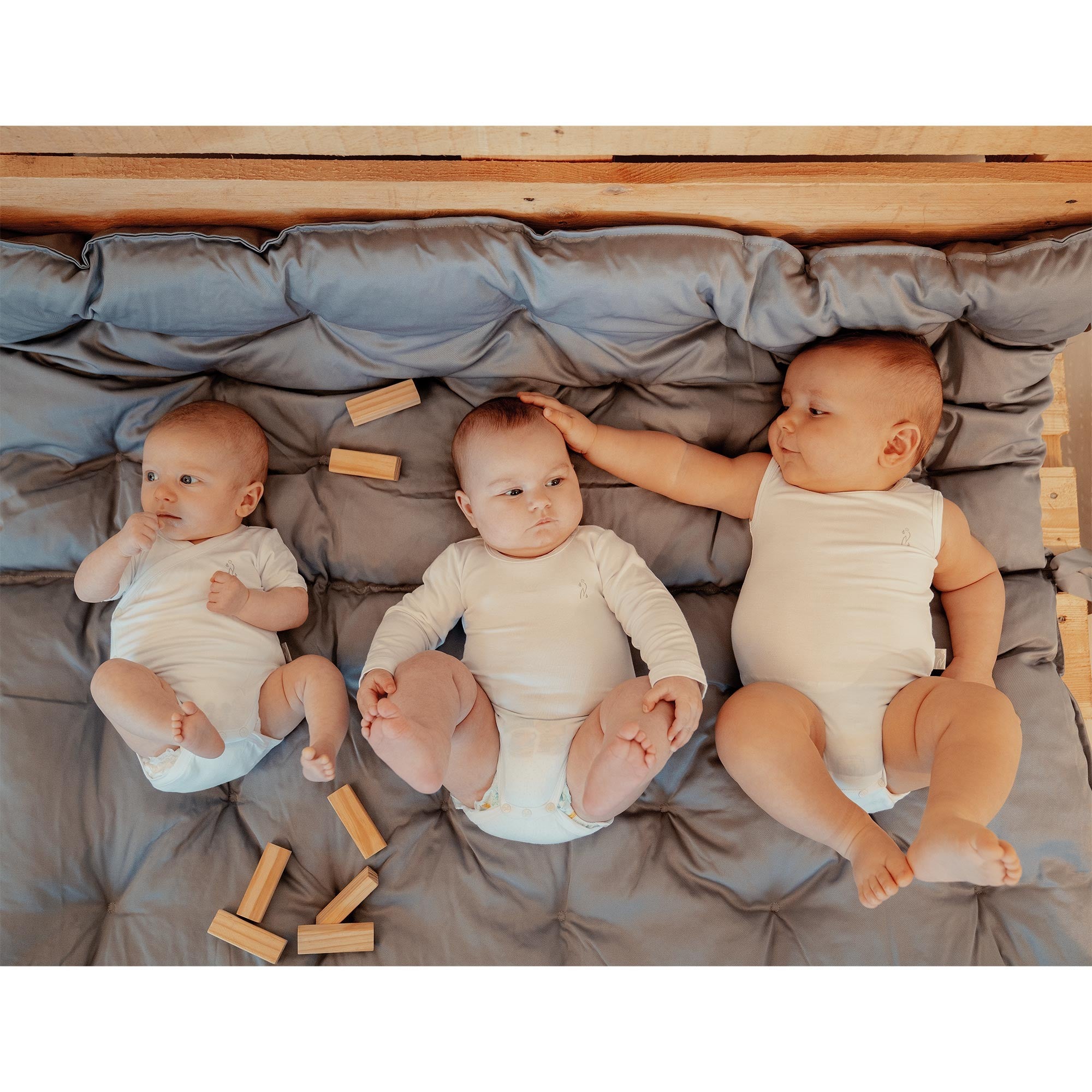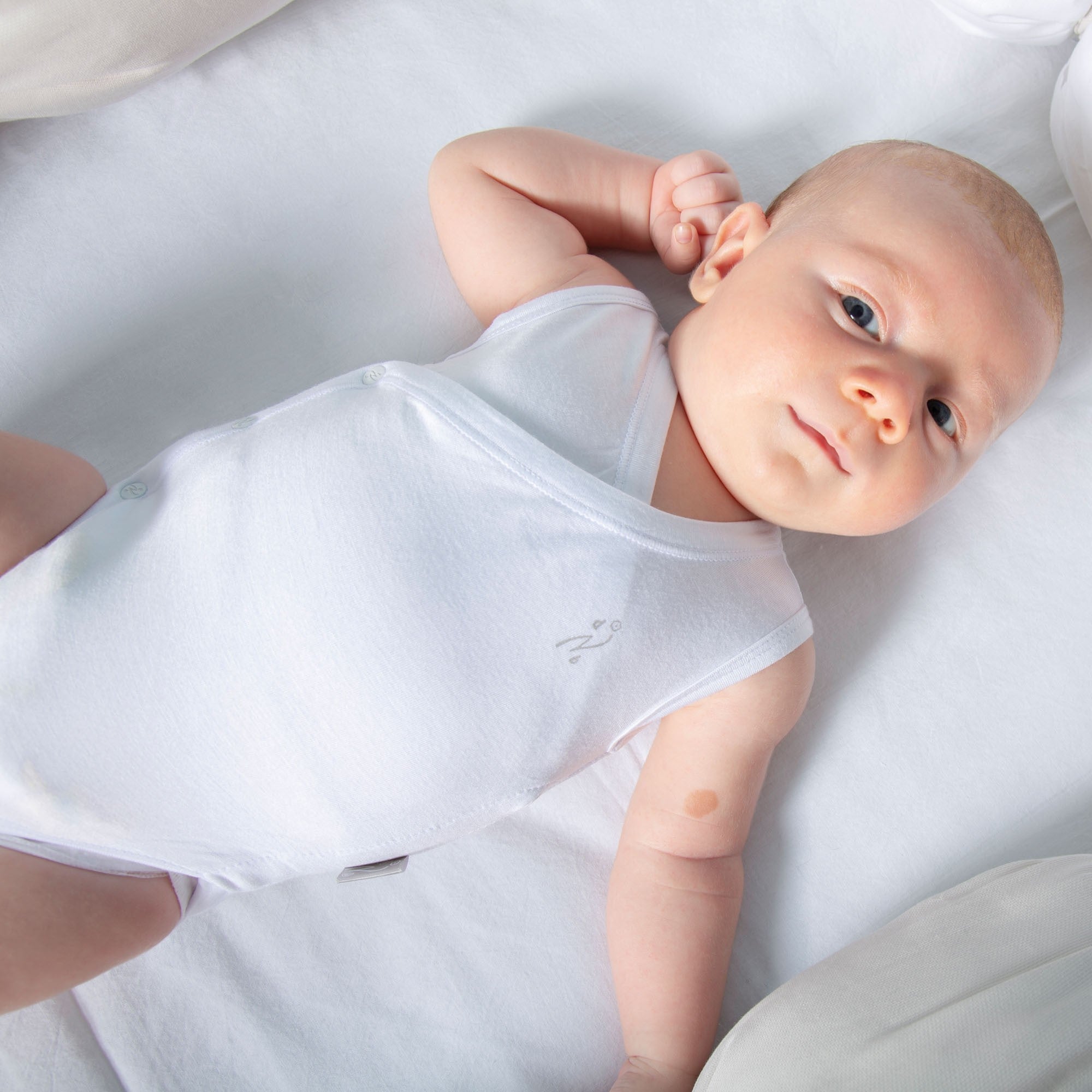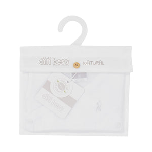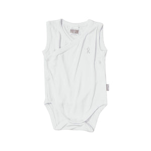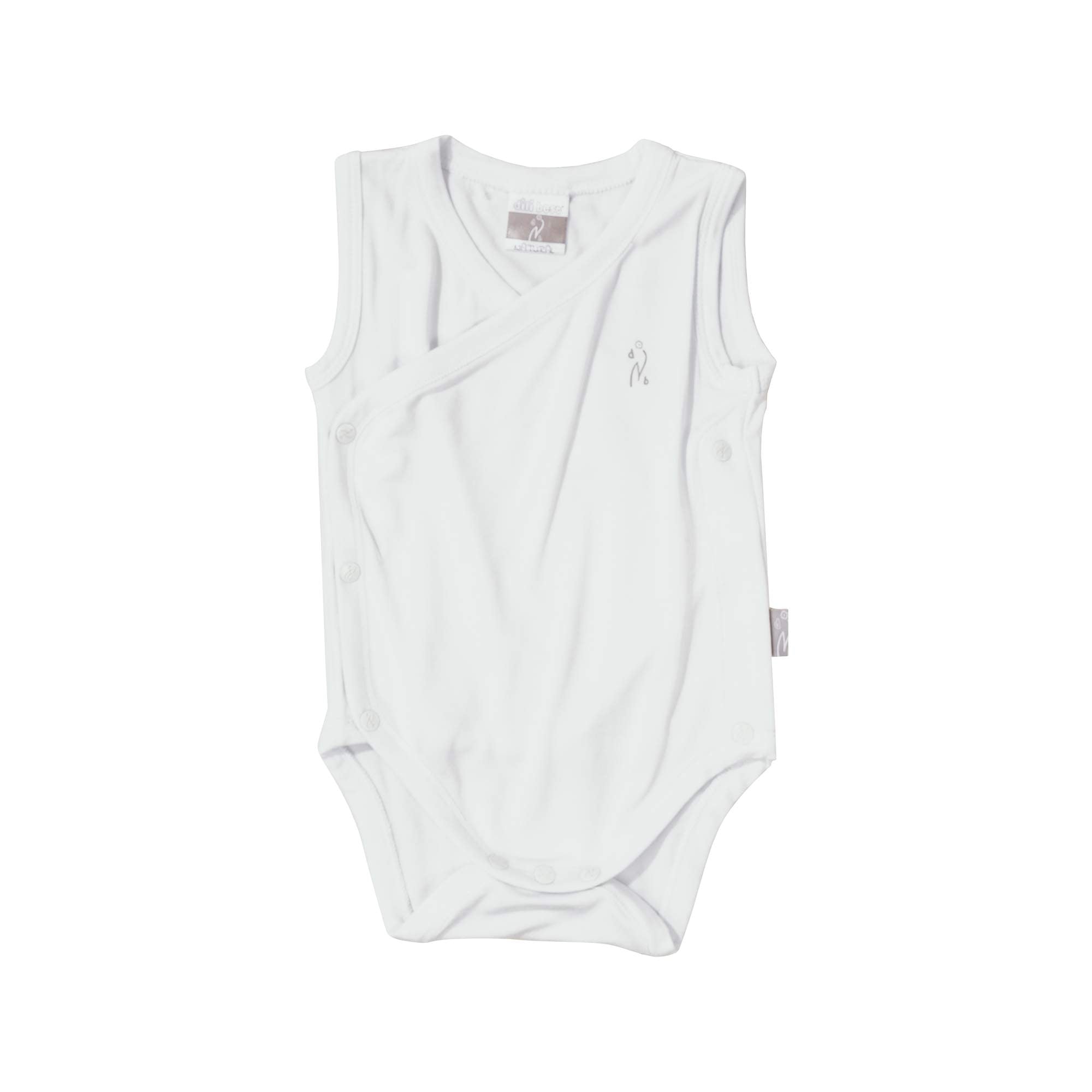 Il Body canottiera incrociato bianco in jersey di bambù ha apertura frontale per facilitare il passaggio della testa del neonato. Ogni bottone è personalizzato con logo “N”.