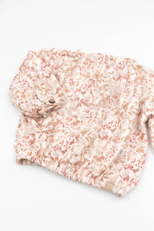 La camicia a palloncino è un capo ideale per infondere un tocco di leggerezza, colore e dolcezza ai guardaroba delle più piccole. Presenta un taglio morbido con maniche a sbuffo e fondo elasticizzato che donano volume e tanto movimento, mantenendo allo stesso tempo il massimo comfort. Realizzata in brushed jersey con stampa floreale Autumn Forest, si posa delicatamente sulla pelle grazie all’unione di fibre naturali: bambù e cotone. Facile da indossare, grazie all’apertura posteriore con bottoncino, è una scelta versatile, perfetta per ogni occasione: dalla scuola a una festa raffinata.