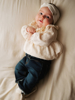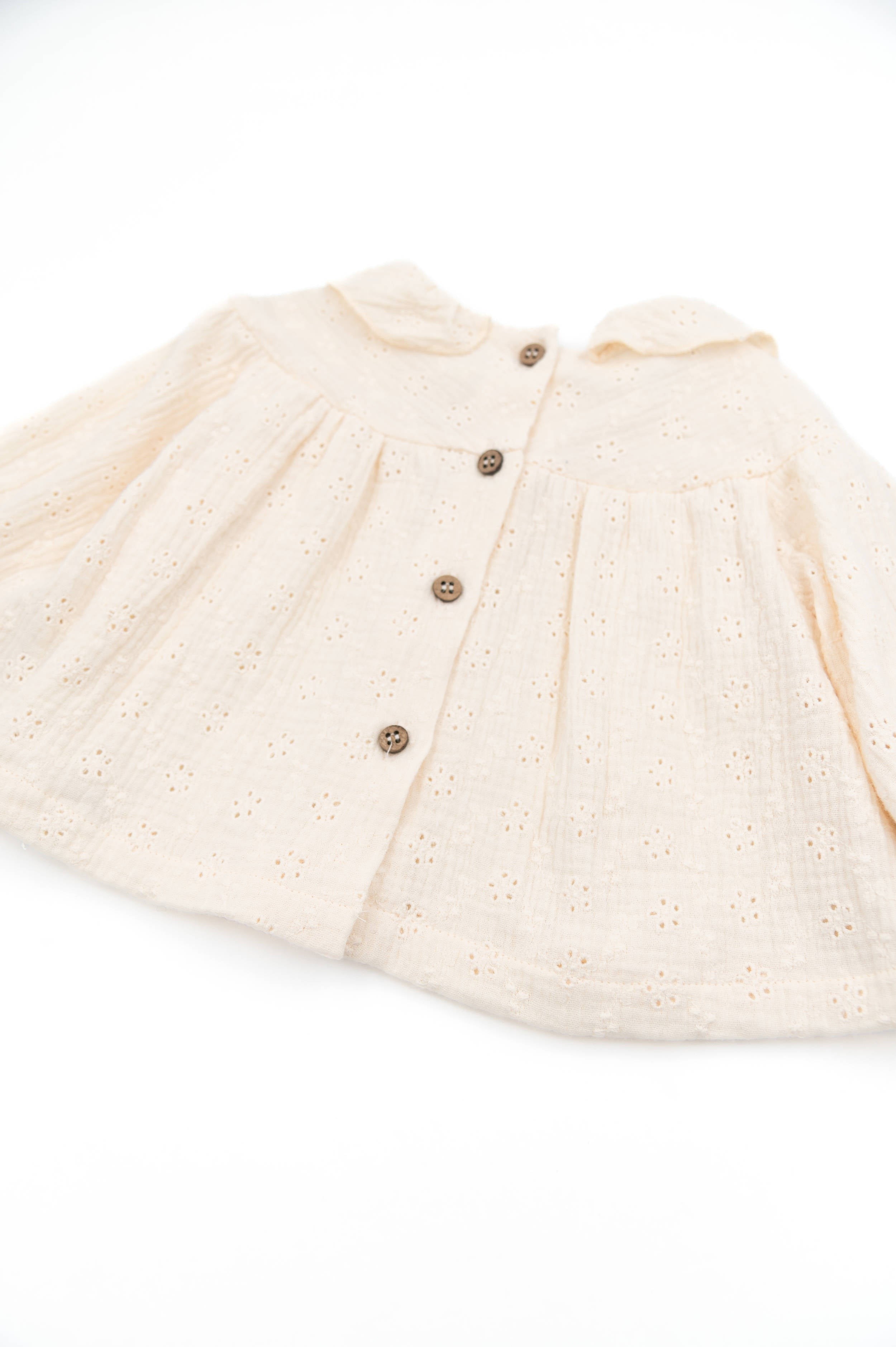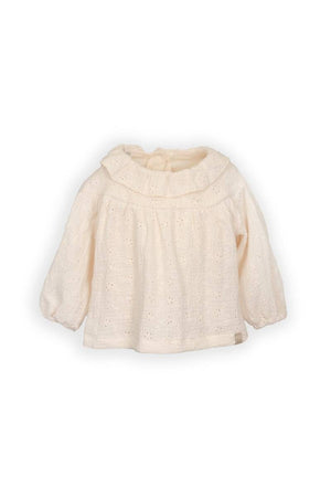Camicia con colletto ampio in Warm White unisce romanticismo e comfort quotidiano. Realizzata in 100 % cotone organico, con dettagli curati e pensati per la pelle delicata della tua bambina.