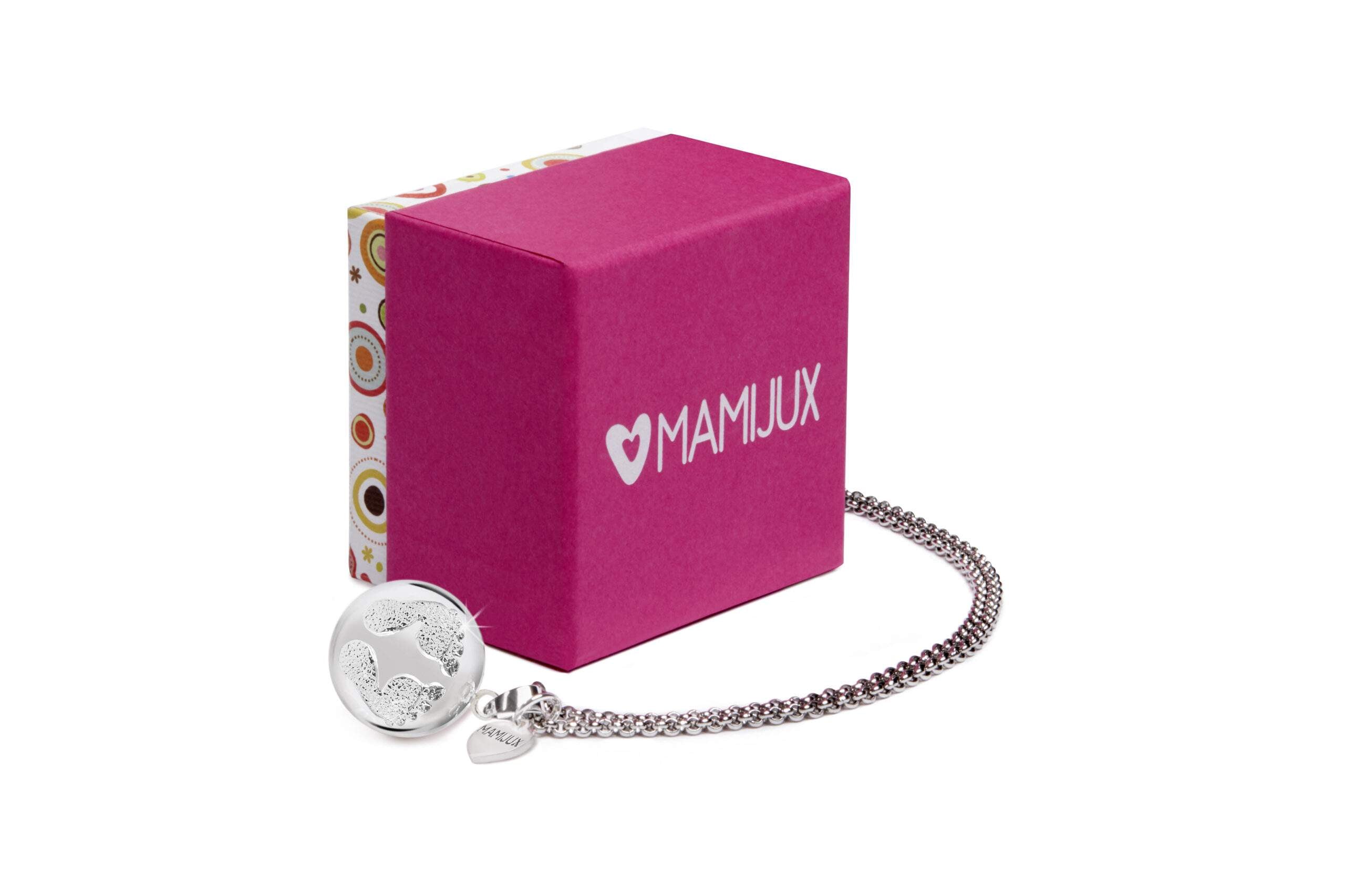 - 1 ciondolo a forma di cuore con inciso il logo MAMIJUX®, in rame con riporto galvanico in argento