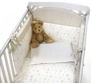Il completo per lettino "Bear" di Questibimbi è composto da 4 pezzi: lenzuolo sotto con angoli, federa, paracolpi e copripiumino. Tutti gli articoli sono realizzati in tessuto 100%cotone 30/27 mentre le imbottiture sono in fibra di poliestere 300gr/mq. Ricamato in filato di cotone effetto impuntura.