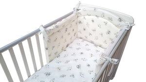 Il set tessile per il lettino Elegance di Questibimbi è sfilabile ed in cotone. Composto da paracolpi, federa guanciale, federa piumone ed imbottitura del piumone.