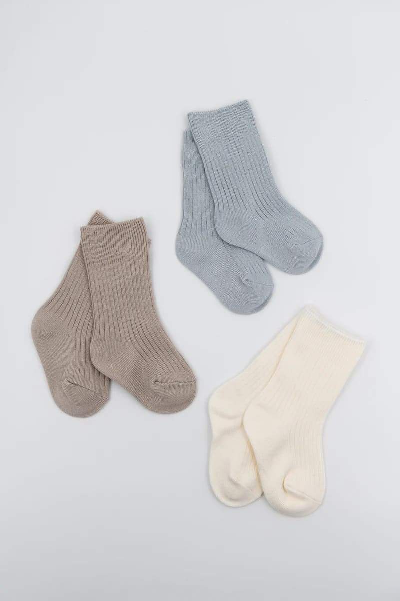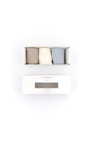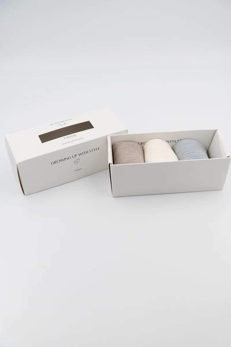 Gift Box Bamboom composto da 3 paia di calze a coste in fibra di bambù naturale, ideale per arricchire gli outfit del tuo bimbo. Una perfetta idea regalo!