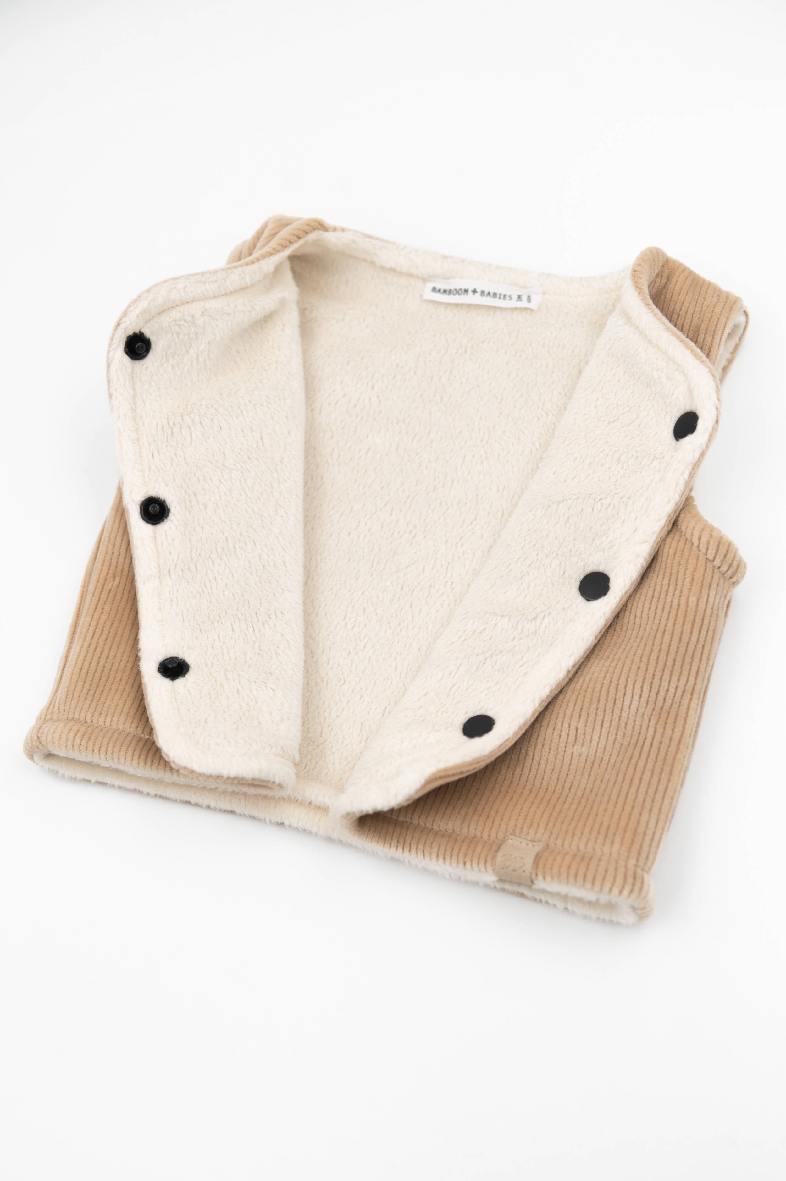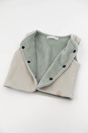 Il Gilet Smanicato Reversibile di Bamboom è un capo versatile e raffinato, pensato per i più piccoli. Realizzato con materiali naturali e sostenibili, offre comfort e stile in ogni occasione. Il design reversibile permette di scegliere tra due look: un lato in velluto a costine per un aspetto classico e raffinato, e un lato in teddy, soffice e caldo, per una sensazione avvolgente e confortevole. Ideale per le giornate più fresche, questo gilet si abbina facilmente con altri capi della collezione Bamboom, aggiungendo un tocco di eleganza al guardaroba del tuo bambino.