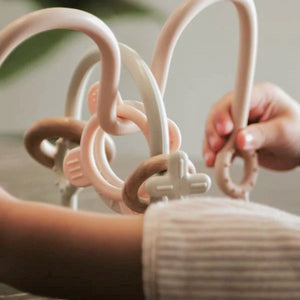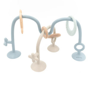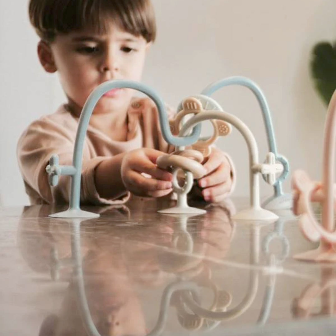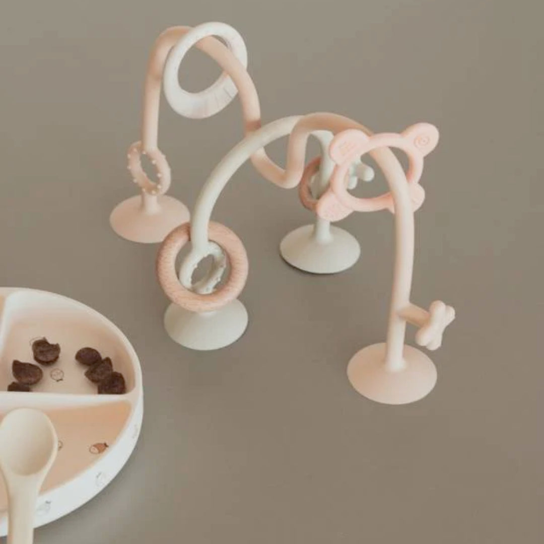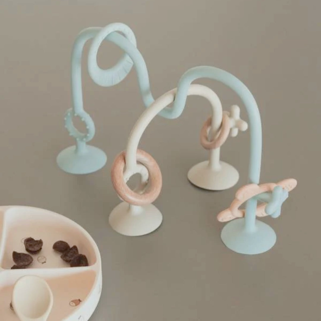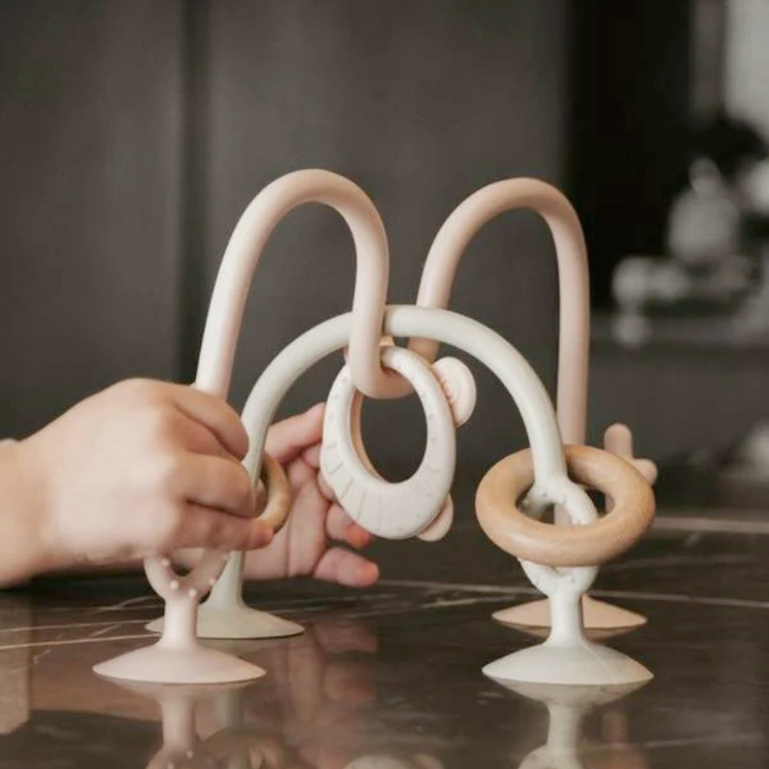 Gioco con ventose in silicone e legno di faggio per lo sviluppo sensoriale del bambino.