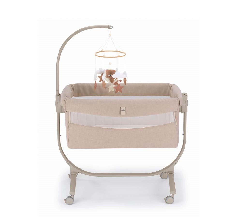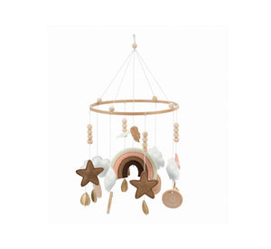 Giostrina universale per culla con struttura in legno e teneri peluches.