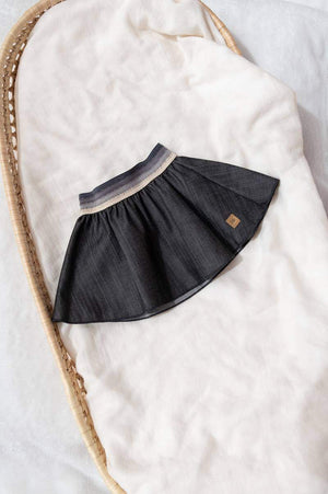 Gonna in jeans con elastico in vita, realizzata in fibra di bambù sostenibile. Dettagli raffinati e tessuto morbido e resistente, questa gonna incarna l'eleganza giocosa perfetta per la tua piccola. Realizzata con amore, offre comfort e stile ineguagliabili per i momenti speciali.
