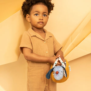 Questo cestino accogliente dà il benvenuto all'incantevole cucciolo Jules. Con il suo morbido pelo, attende di essere coccolato. Accanto a lui, una ciotola e un osso da masticare, pronto per essere rosicchiato. Il bambino gli infila la sua piccola giacca e lo accarezza delicatamente. Jules abbaia felicemente quando viene curato.