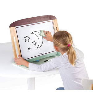 Una grande lavagna portatile, fronte-retro, per disegnare ovunque. Da un lato, l’ardesia nera su cui i bambini potranno disegnare grazie ai 2 grandi gessetti forniti. Dall’altro, potranno invece esercitarsi a scrivere con il pennarello cancellabile sul lato bianco magnetico.