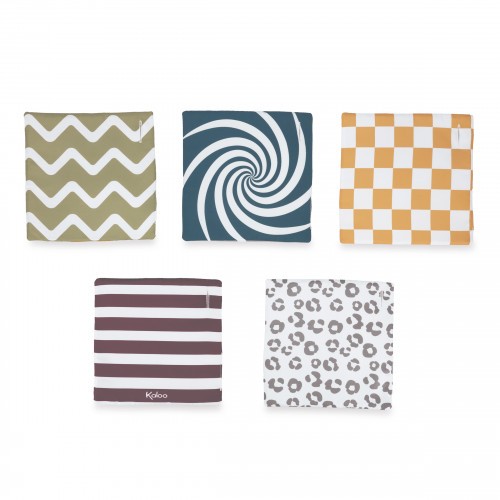 5 carte di consapevolezza sensoriale, parte della gamma Kaloo Stimuli - sviluppata in collaborazione con terapisti psicomotori per supportare lo sviluppo sensoriale e motorio del bambino fin dai suoi primi giorni.