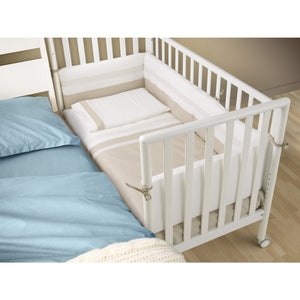 Culla fianco letto: regolabile in altezza e completa di cinghie di aggancio per dormire accanto al neonato in totale sicurezza.