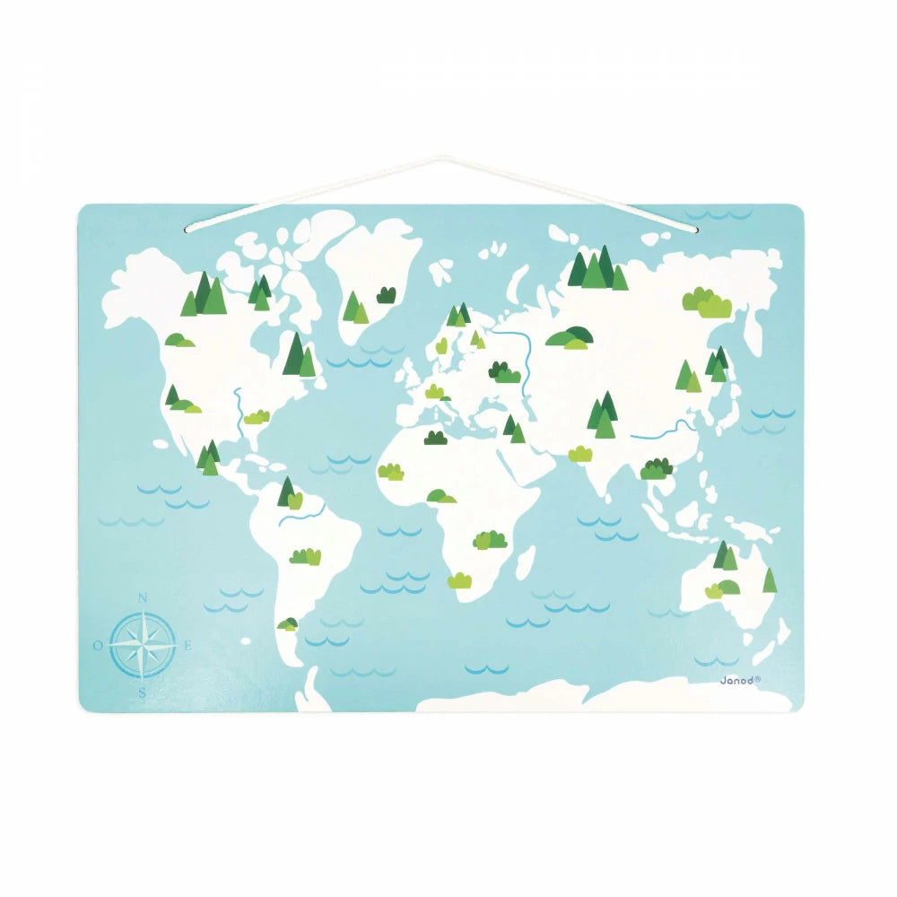I magneti, realizzati in legno certificato FSC®, sono robusti, maneggevoli e perfetti per le piccole mani. La mappa può essere appoggiata su un tavolo o appesa grazie alla pratica cordicella, e i magneti possono essere utilizzati anche per inventare storie e giochi di fantasia.