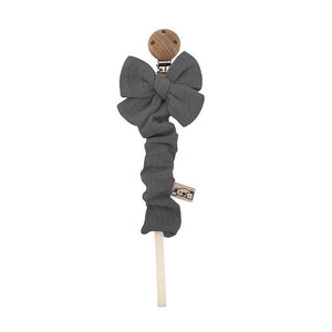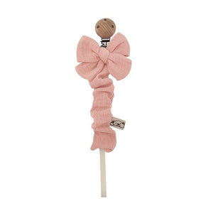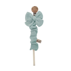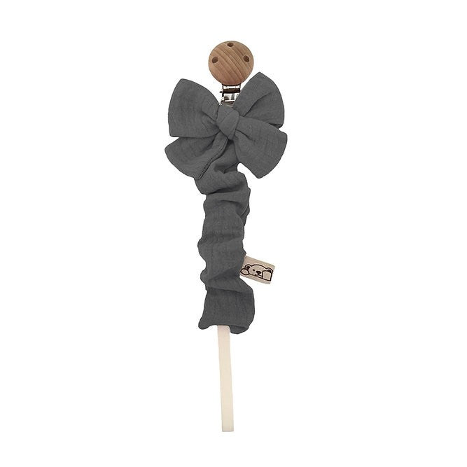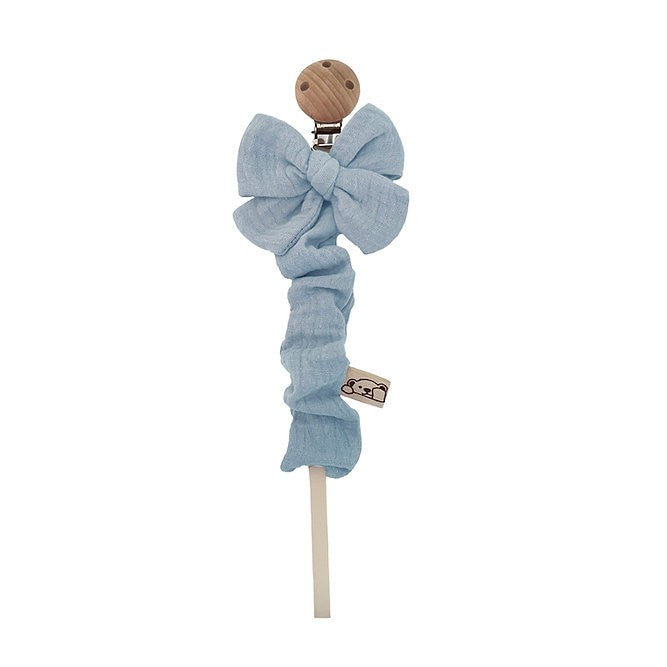 Scopri il portaciuccio con fiocco, un accessorio pratico ed elegante, perfetto per tenere il succhietto del tuo bambino sempre a portata di mano. Realizzato in mussola 100% cotone, il tessuto è certificato Oeko-Tex Standard 100 Classe I, garantendo la massima sicurezza e qualità. La clip in legno naturale assicura un uso sicuro e durevole.