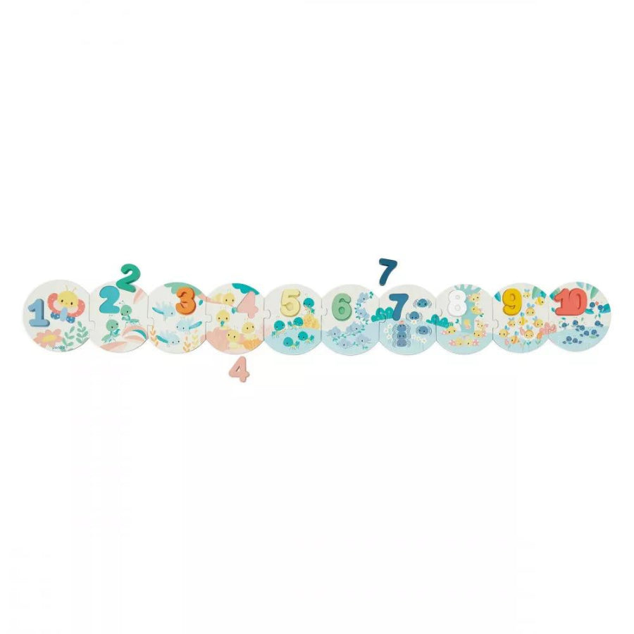 Dopo aver ricostruito questo simpatico puzzle da 10 pezzi dai colori pastello, sarà necessario posizionare i numeri al posto giusto. Basta seguire l'ordine numerico... O contare gli animali su ciascun pezzo! 3 libellule, 8 coccinelle... I conti tornano!