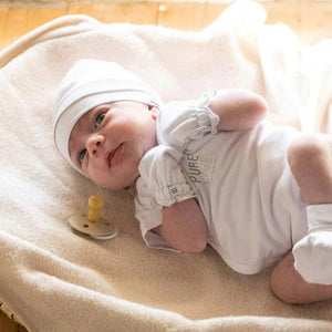 Il set nascita con cappellino/cuffietta senza cuciture all'interno e babbucce per neonato in bamboo organico, entrambi indispensabili per i primi giorni di vita del bebè.