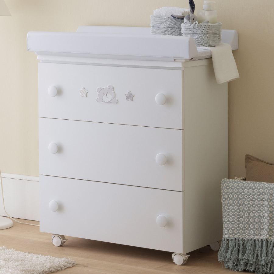 Cassettiera fasciatoio dalla linea Teo di Pali, perfetta per poter conservare tutto ciò che occorre al tuo bambino e potergli fare il bagnetto. Con dolci decorazioni!
