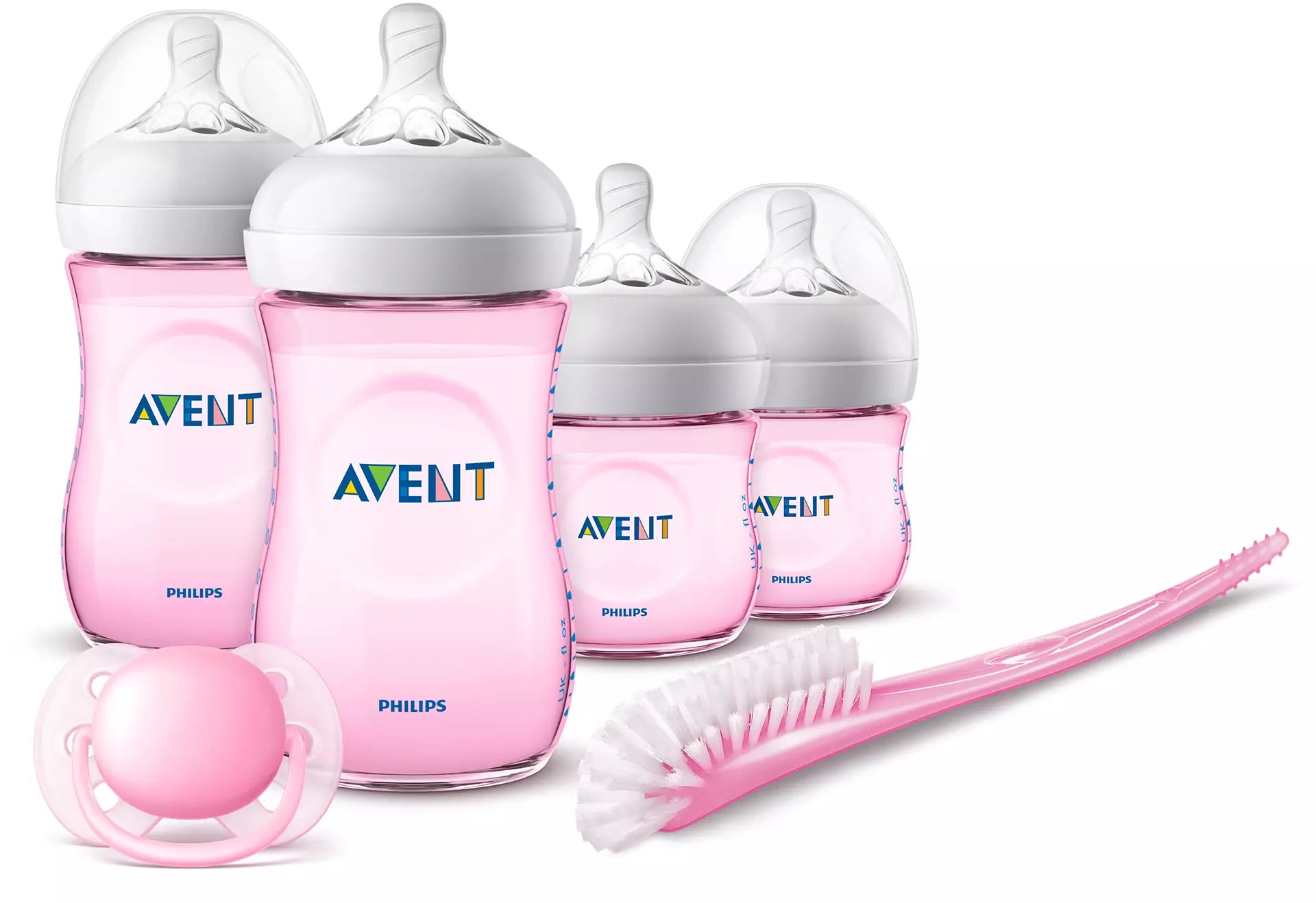 Il set prime poppate di Philips Avent include 4 biberon Natural, uno scovolino per biberon e tettarella e un succhietto traslucido per bimbi da 0 a 36 mesi.