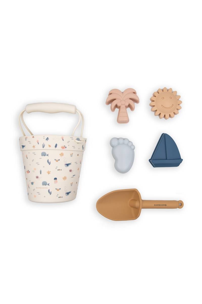 Il Set Spiaggia Bamboom con stampa Sealife è l’accessorio perfetto per accompagnare le giornate al mare dei più piccoli. Realizzato in silicone alimentare morbido e resistente, è sicuro, pratico e facile da pulire. Il set include un secchiello con manico comodo e flessibile, una paletta e quattro formine con simpatici soggetti marini. Ideale per stimolare la fantasia e la creatività dei bambini mentre giocano con sabbia e acqua.