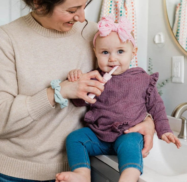 - Impugnatura condivisa: Grazie all'impugnatura lunga, genitori e bambini possono tenere insieme lo spazzolino, favorendo l'apprendimento e i primi movimenti di pulizia.