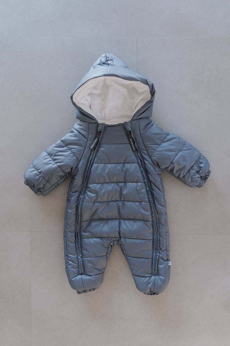 Con ingegnoso sistema di cerniere per poterla indossare facilmente e comodo cappuccio per tenere la testa del tuo bambino sempre al riparo.