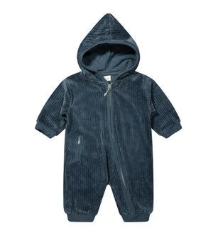 Morbida tutina in velluto a coste con cappuccio, tasca e cerniera.