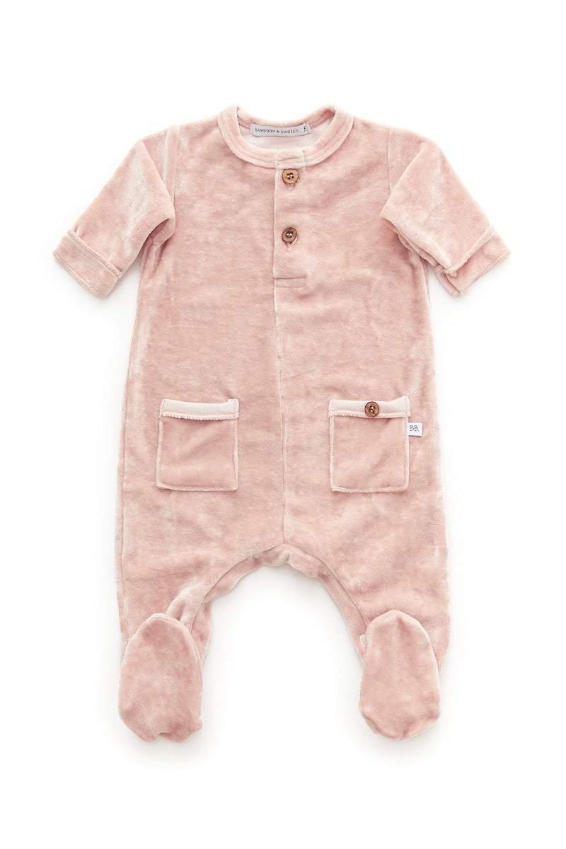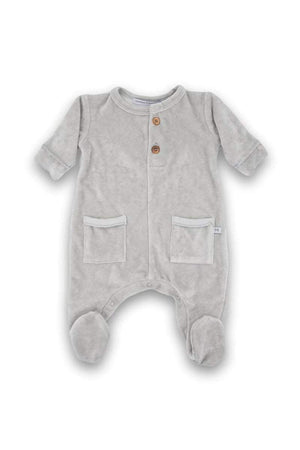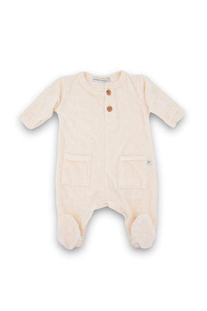 Una tutina intera in velluto, ideale per la stagione fredda. Con maniche lunghe e bottoni di legno sul davanti.